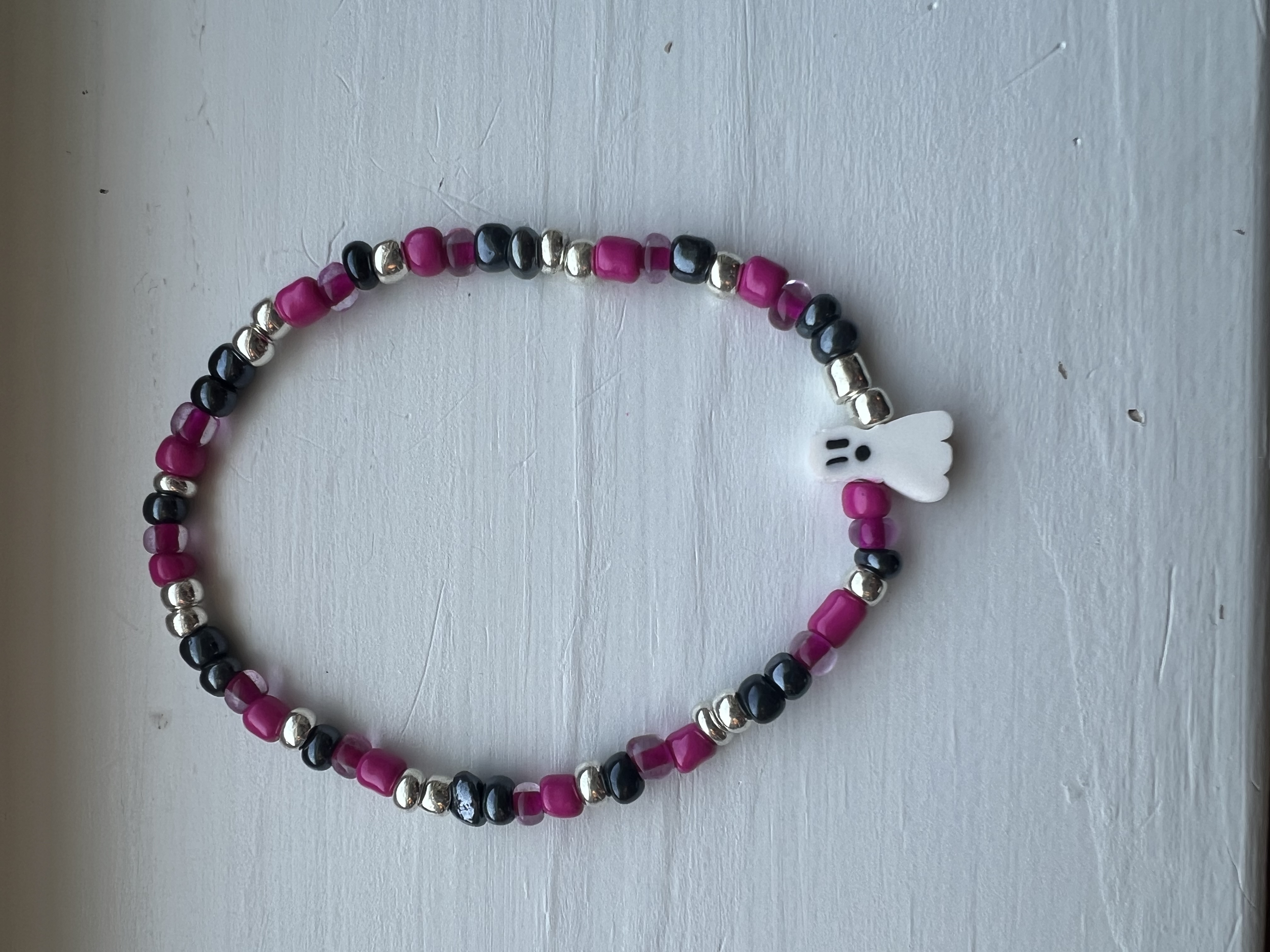 Step into spooky season with style in the Berry Ghost Bracelet. This beaded stretch bracelet combines glossy black, bold fuchsia pink, and silver accents with a charming little ghost centerpiece. It’s the perfect mix of edgy and playful — great for stacking with other bracelets or wearing on its own as a statement piece. Lightweight, comfortable, and full of Halloween spirit, this bracelet is ideal for anyone who loves mixing spooky vibes with chic fashion.