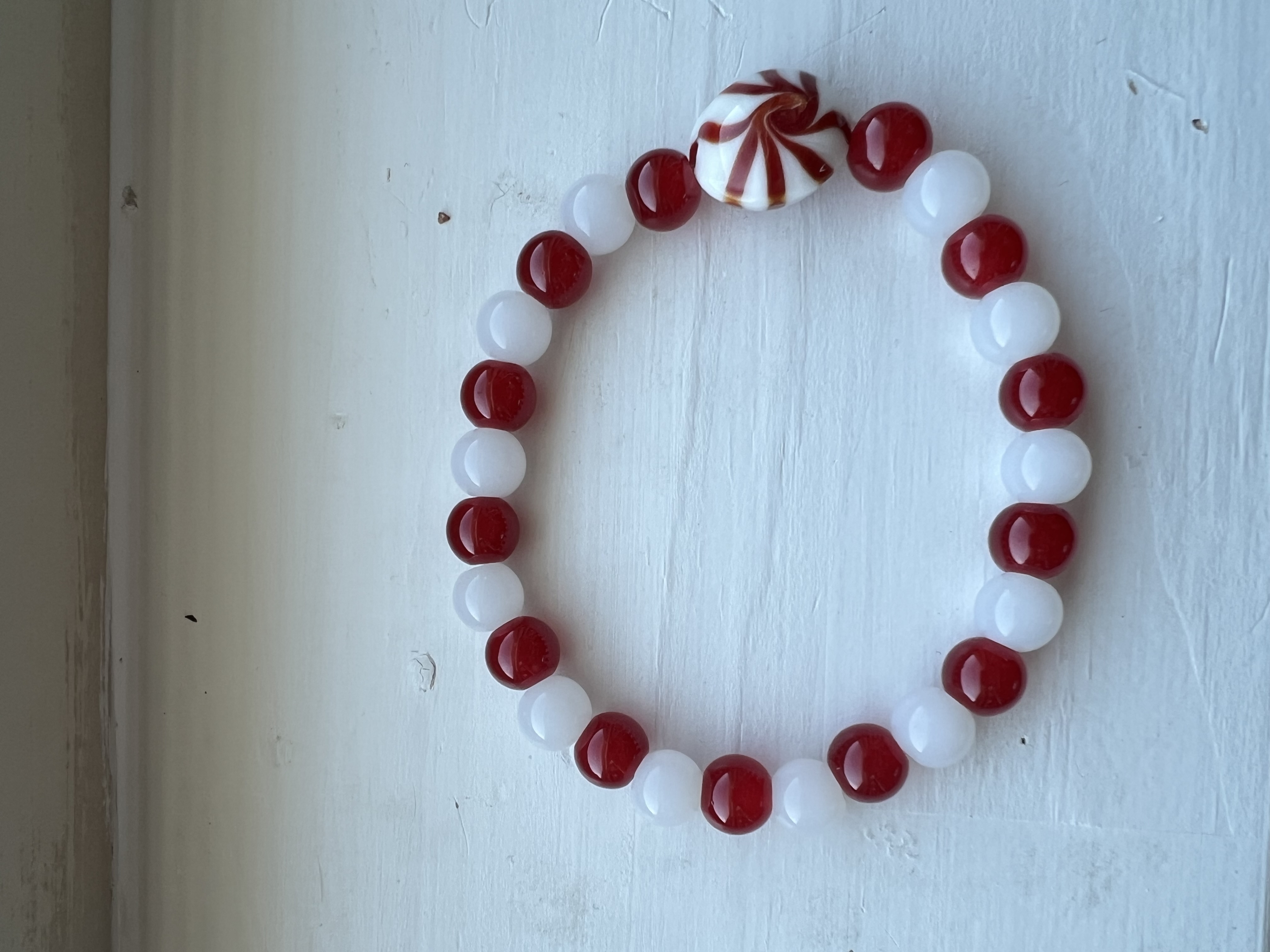 Once the pattern is complete, I add a single peppermint candy charm as the finishing touch — a sweet, eye-catching detail that gives the bracelet its playful personality. Each piece is then checked for balance, shine, and comfort, ensuring it’s as durable as it is delightful.