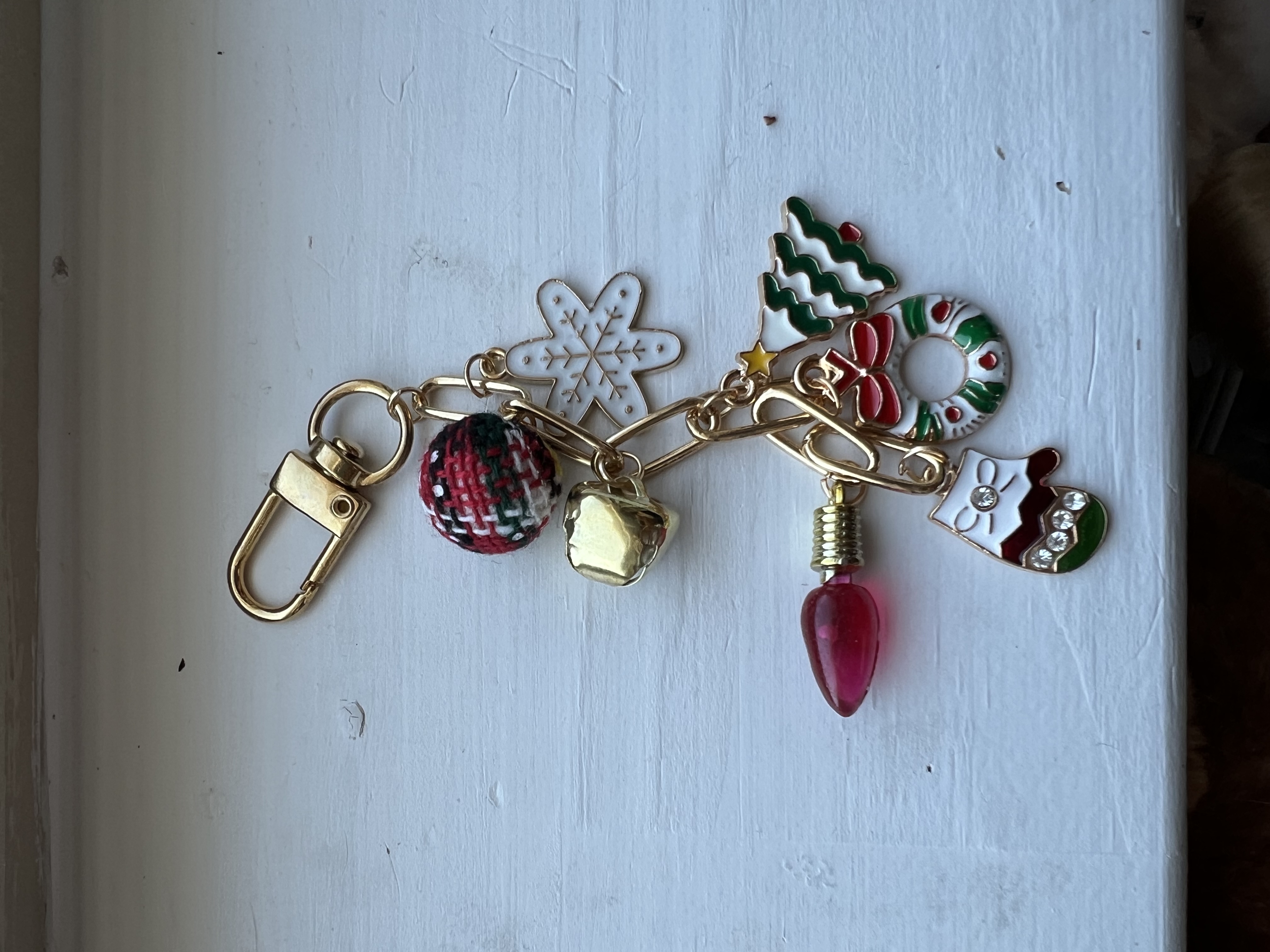 The snowflake adds a touch of winter magic, the Christmas tree and wreath bring in classic holiday color, and the tiny stocking and golden bell celebrate the coziness of Christmastime. A red light bulb charm and a soft plaid ornament ball complete the look — blending shine, texture, and whimsy into one cheerful piece.