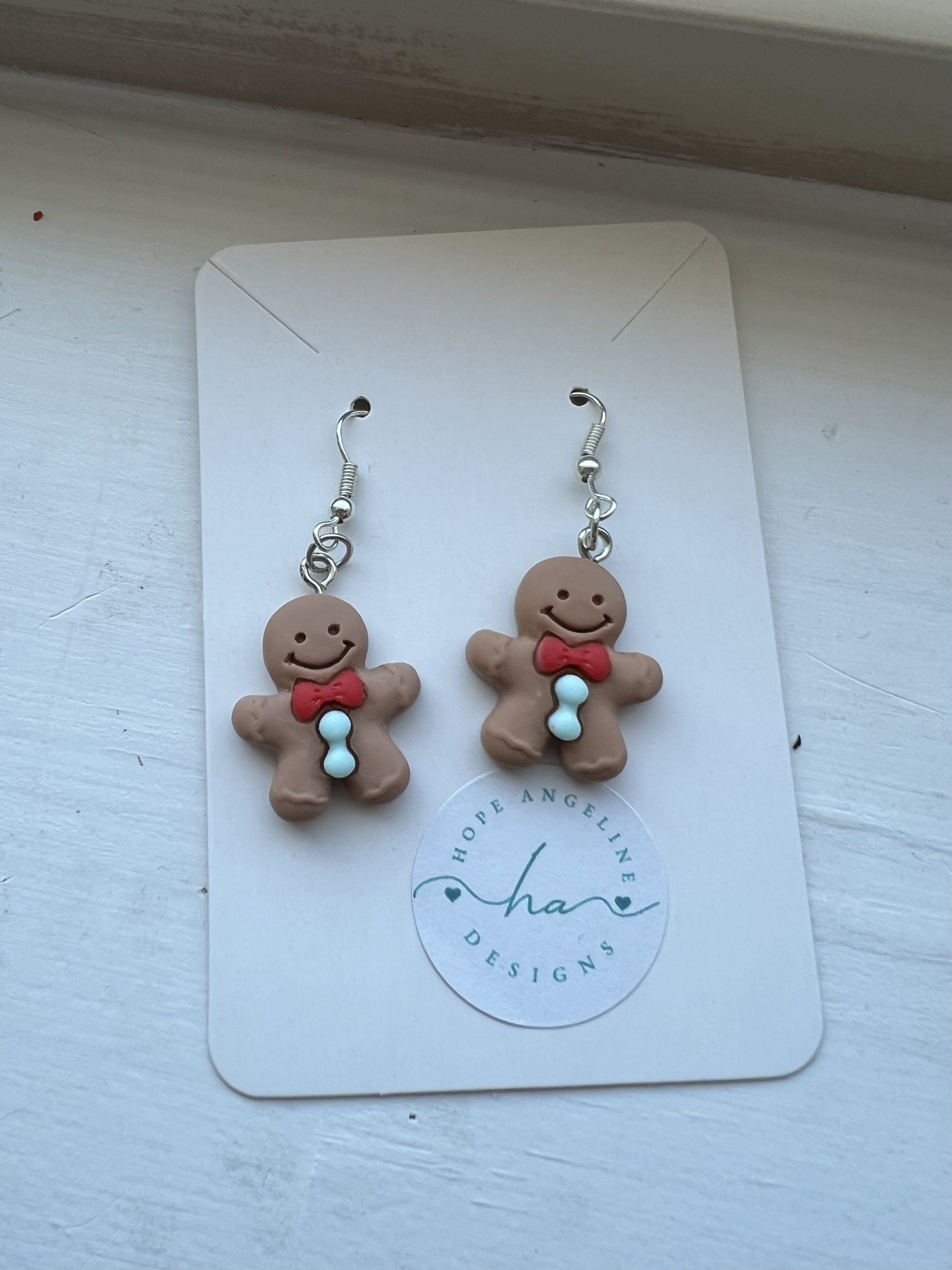 Say hello to the Frosted Fellows — cheerful little gingerbread men ready to sweeten up your holiday season! With their bright red bow ties, frosty blue buttons, and warm smiles, these earrings capture the simple joy of a freshly baked Christmas cookie.