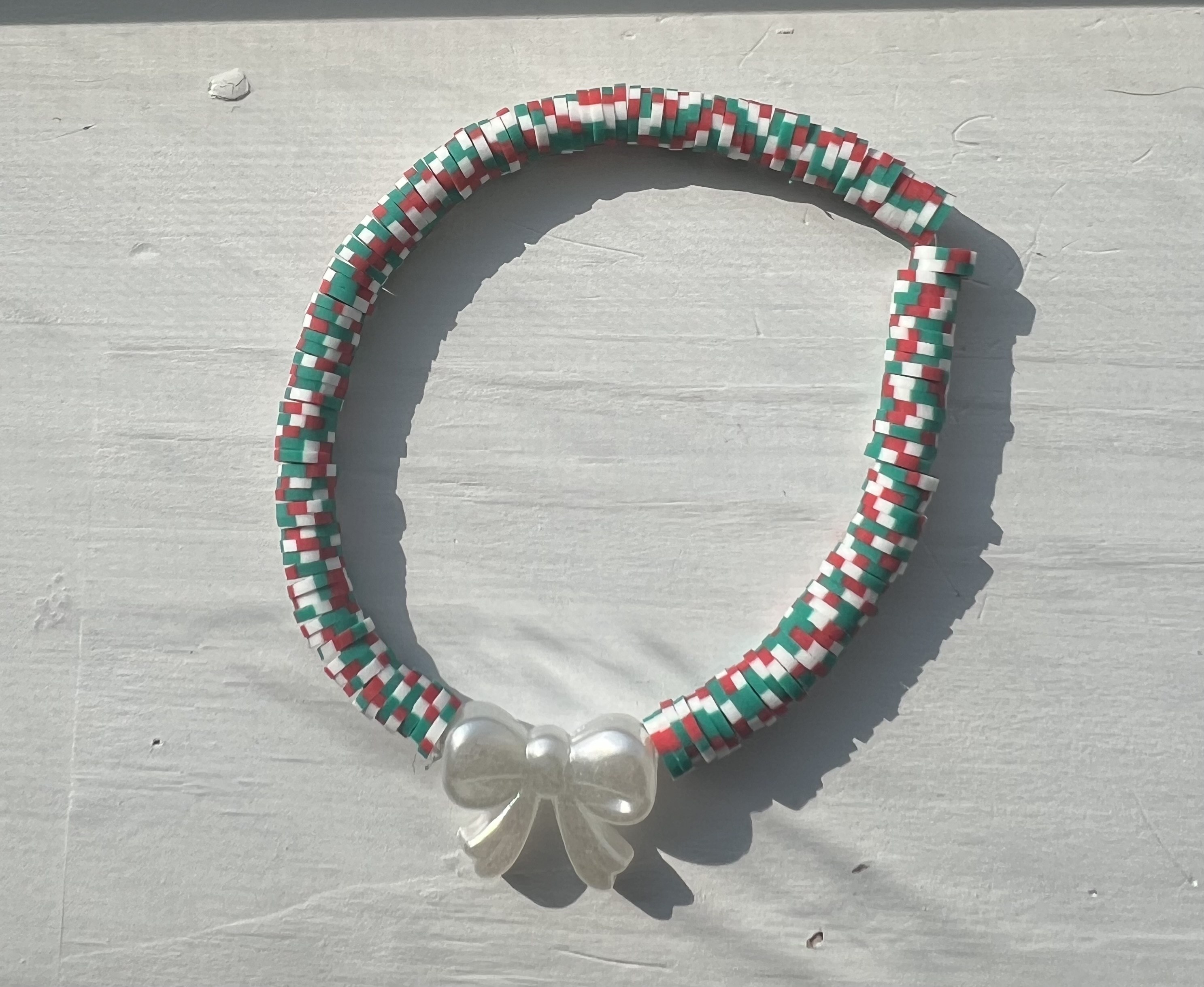 At the center, a glossy pearl-white bow charm is added to bring a touch of sweet holiday elegance. The bracelet is finished on stretchy, durable cord, allowing it to slip on easily and maintain its shape throughout the season. Every piece is made with care to ensure a neat, even pattern and a polished, professional finish.
