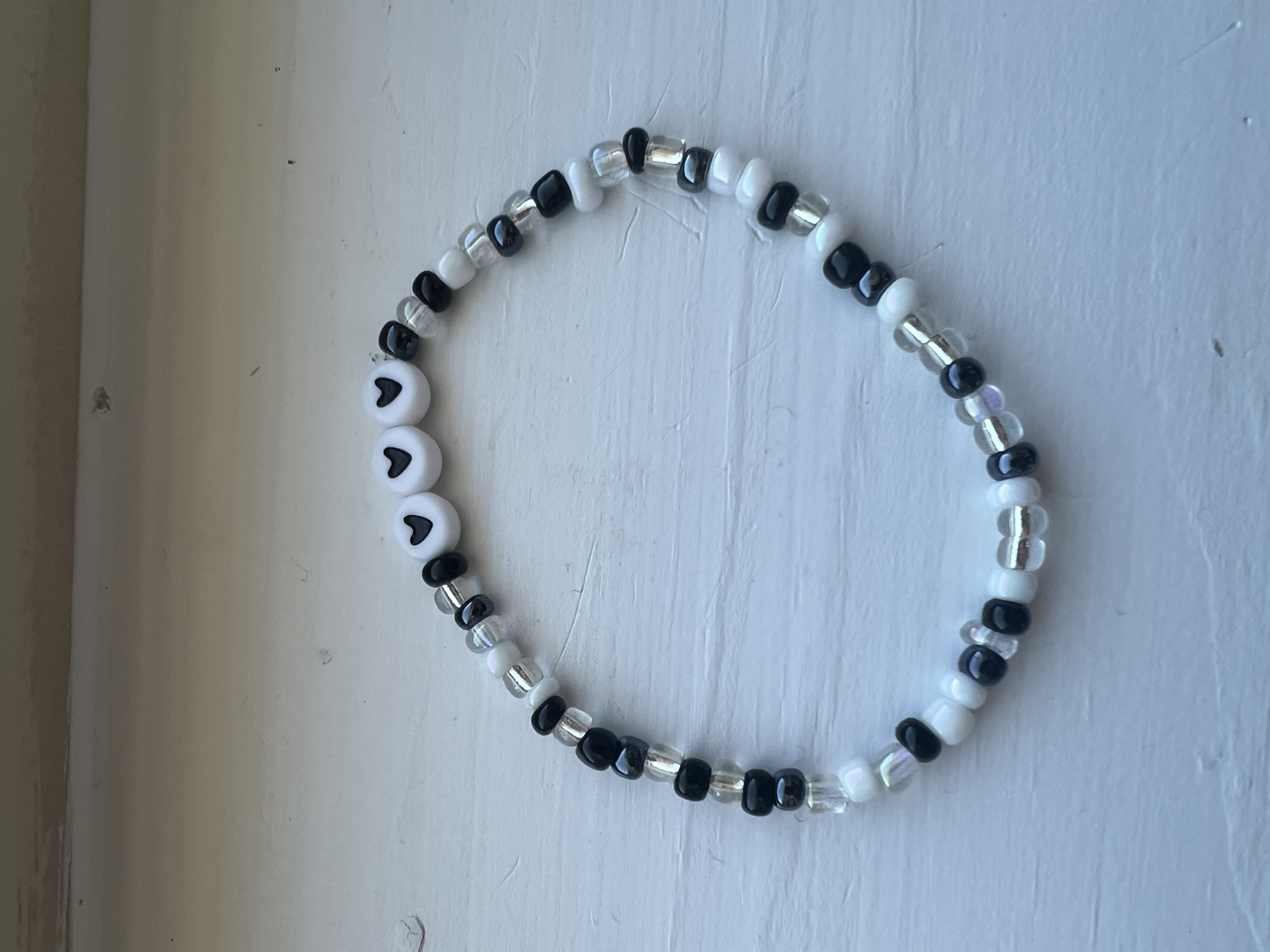 The Monochrome Valentine Promise Beaded Bracelet is handcrafted using a mix of black, white, and clear seed beads, carefully strung on a durable stretch cord for a comfortable slip-on fit. Heart-accent beads are placed at the center to create a simple yet romantic focal point. Each bracelet is made with care to ensure balance, comfort, and lasting beauty.
