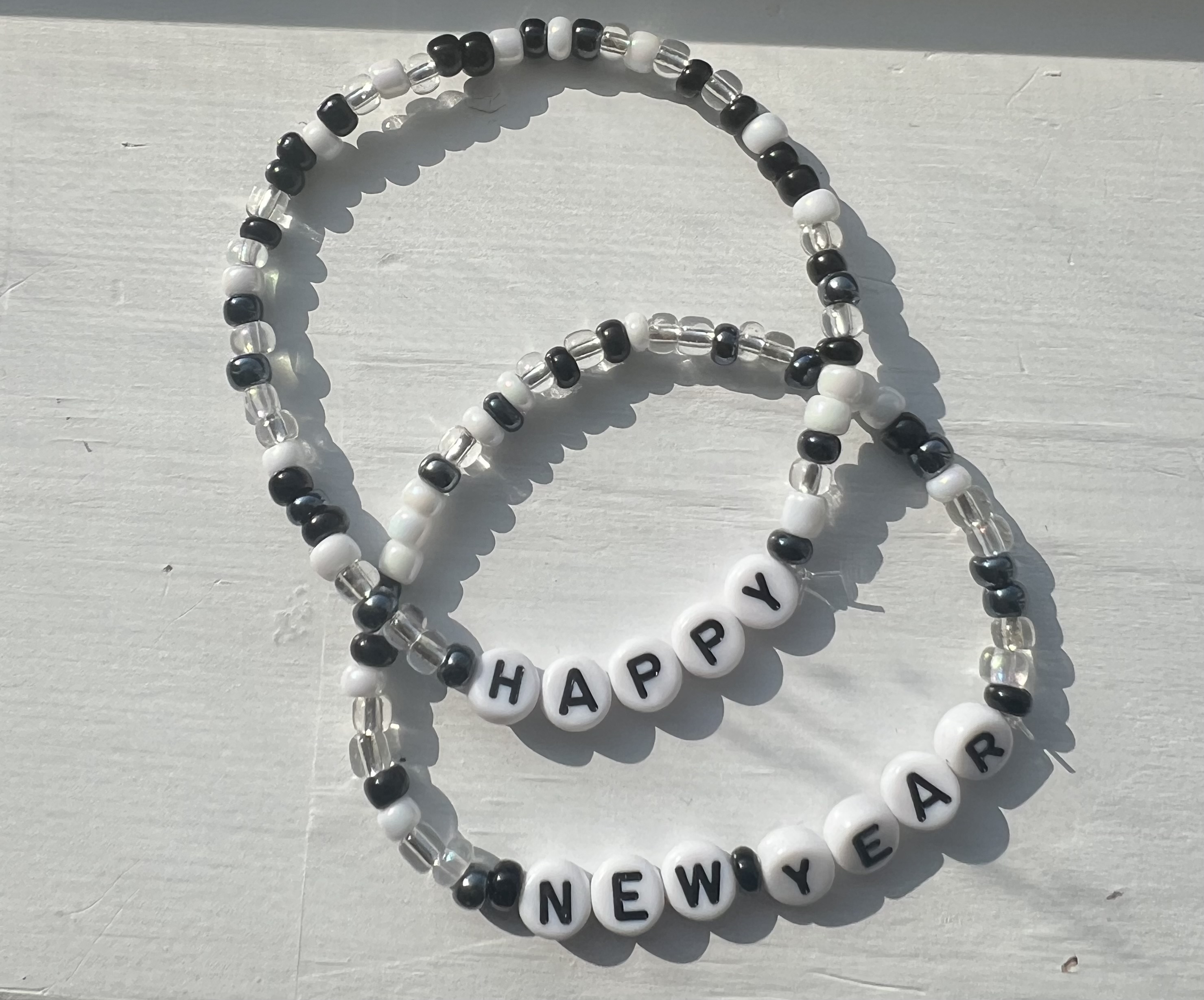 One bracelet features the word HAPPY, while the second spells NEW YEAR, using clean white letter beads with bold black lettering for a sleek, minimalist look. Together, they form a celebratory message that’s perfect for parties, countdown photos, gifting, or adding a subtle New Year’s sparkle to everyday wear.