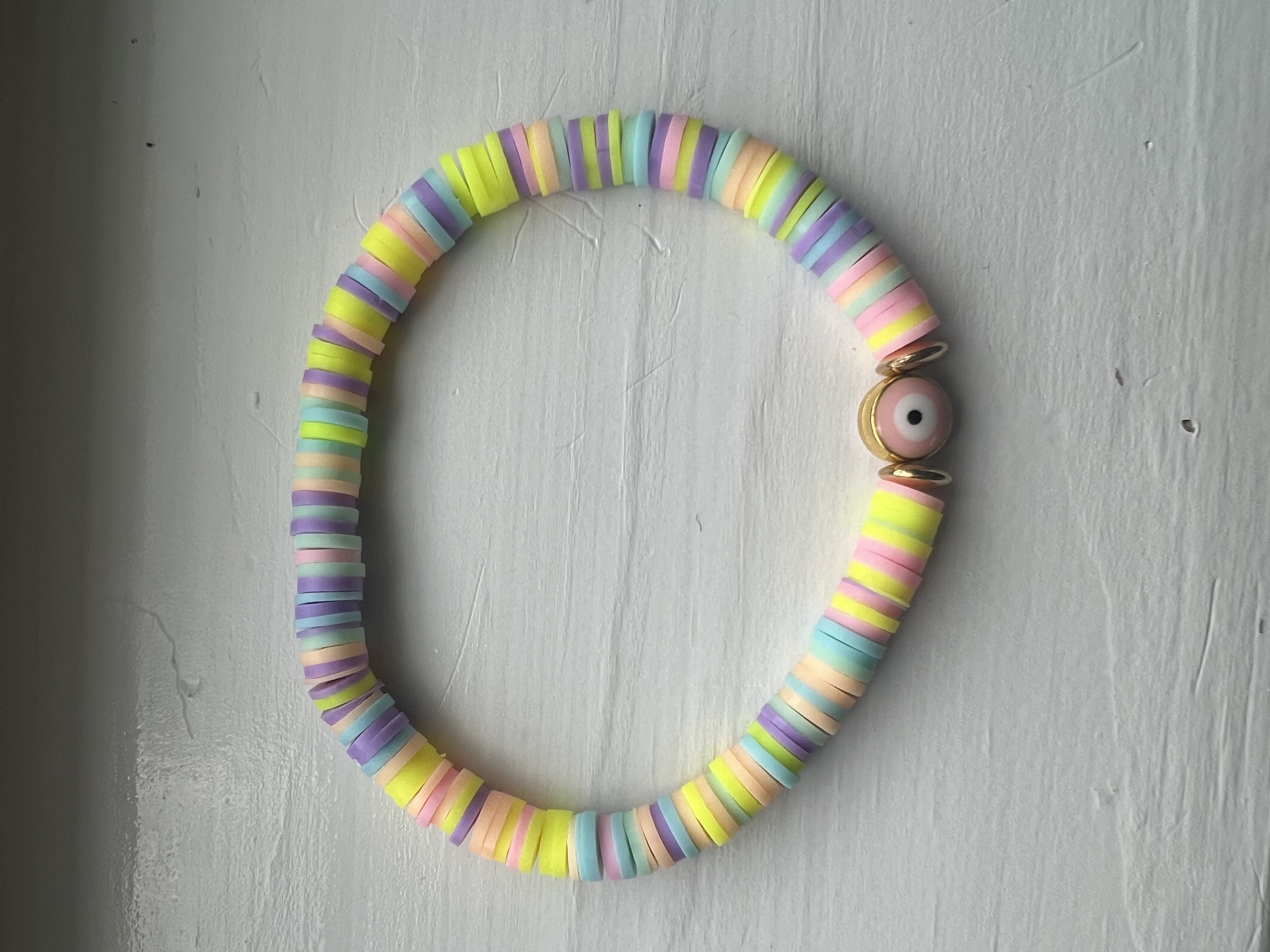Whimsical and full of charm, the Sugar Spell Bracelet is a playful blend of pastel magic and protective energy. Made with soft rainbow-striped heishi beads and finished with a pink evil eye charm framed in gold tone, this bracelet is like a candy-coated talisman. Lightweight, colorful, and enchantingly cute, it’s a sweet little spell for good vibes and style. Whether you wear it for its symbolism or its aesthetic, Sugar Spell brings a pop of joy and charm to every look.