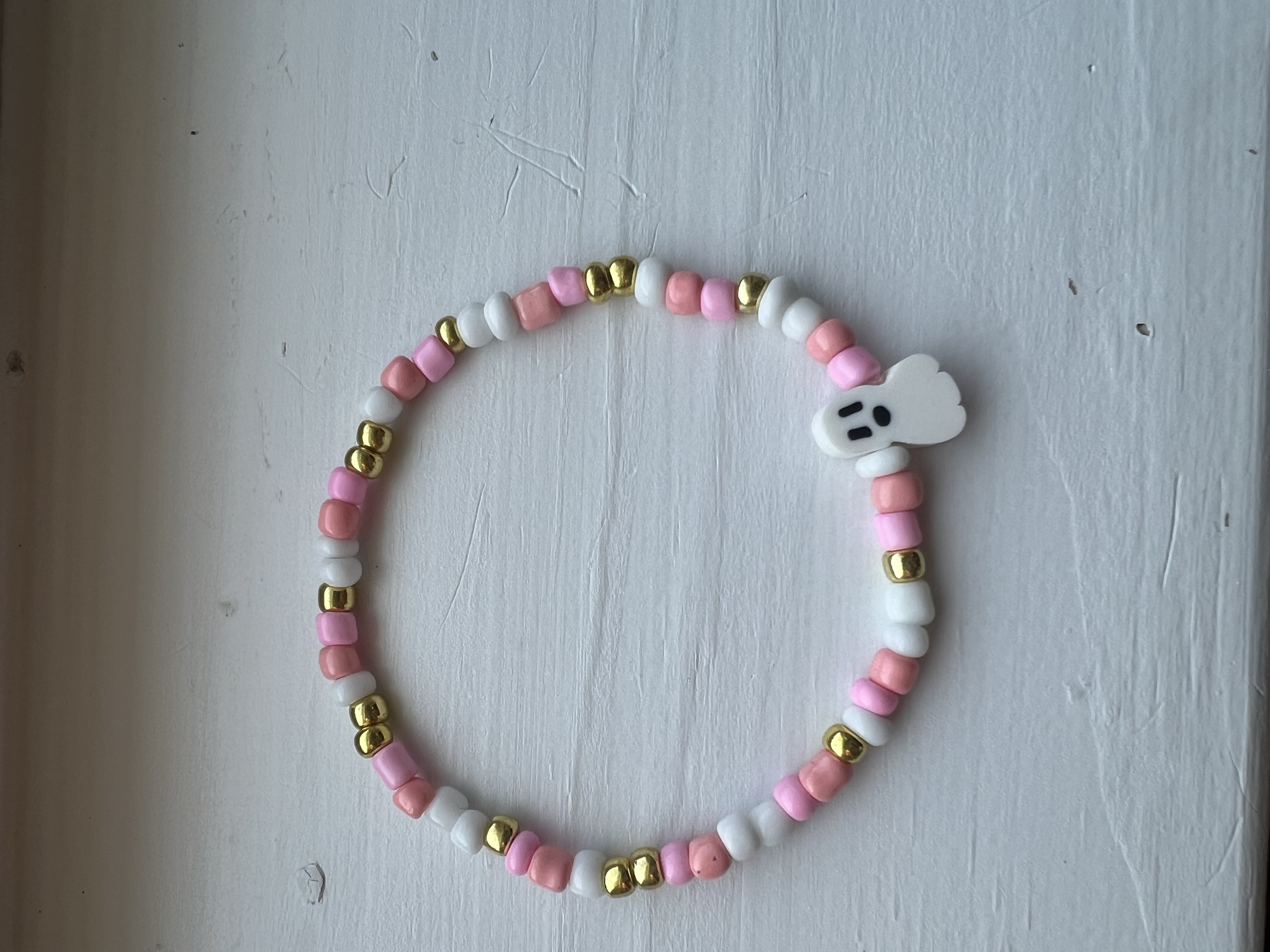 Add a touch of spooky sweetness to your style with the Sweet Phantom Bracelet. Featuring a playful mix of soft pink, crisp white, and shimmering gold beads, this stretchy bracelet is finished with a tiny ghost charm for the perfect balance of cute and spooky. Lightweight and easy to wear, it’s ideal for stacking with other bracelets or wearing solo as a charming Halloween accessory.