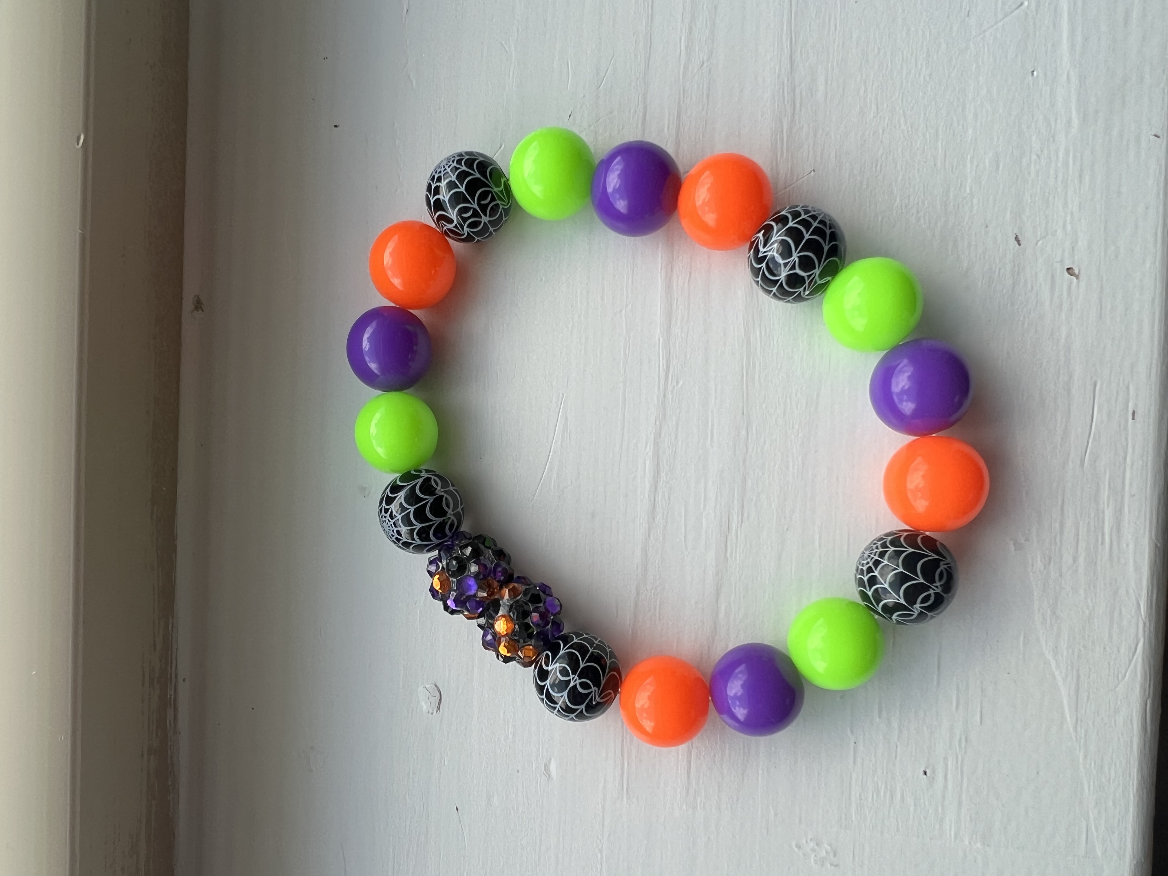 Each Wicked Webs Bracelet is handcrafted with high-gloss neon beads in orange, green, and purple, paired with black beads detailed in white spiderweb designs. A sparkling rhinestone bead adds extra Halloween shimmer. All components are strung on durable elastic cord, knotted for strength, and trimmed for a smooth, comfortable fit.