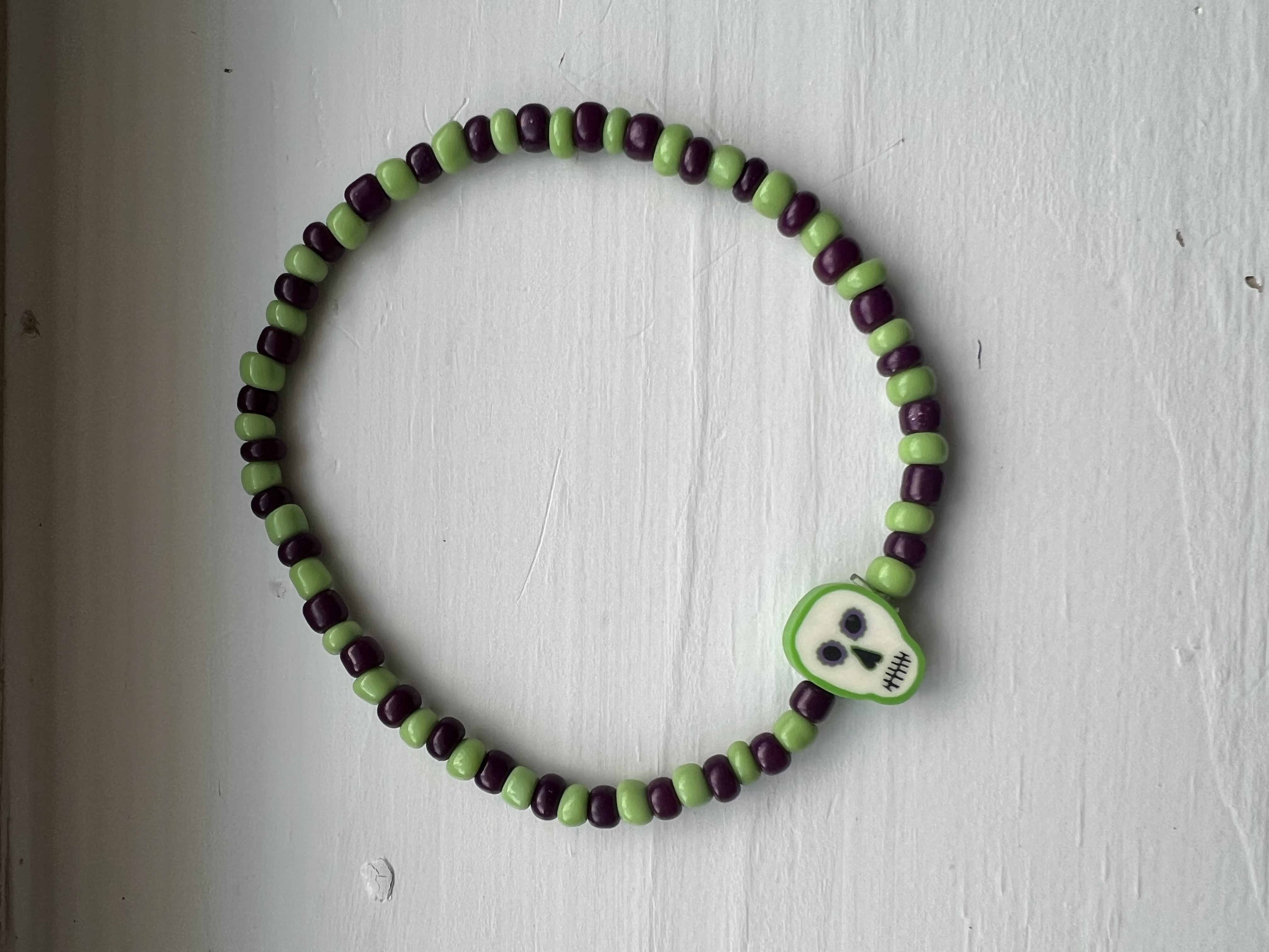 Unleash spooky charm with the Zombie Relic Bracelet — a playful Halloween accessory featuring glossy lime-green and deep plum seed beads, accented by a quirky skull focal bead. Strung on strong, stretchy cord, this handmade bracelet slips on easily and adds a fun dose of fright to any outfit. Whether you’re decking out your Halloween costume, heading to a themed party, or just love ghoulish jewelry, Zombie Relic is the perfect bite of spooky style.
